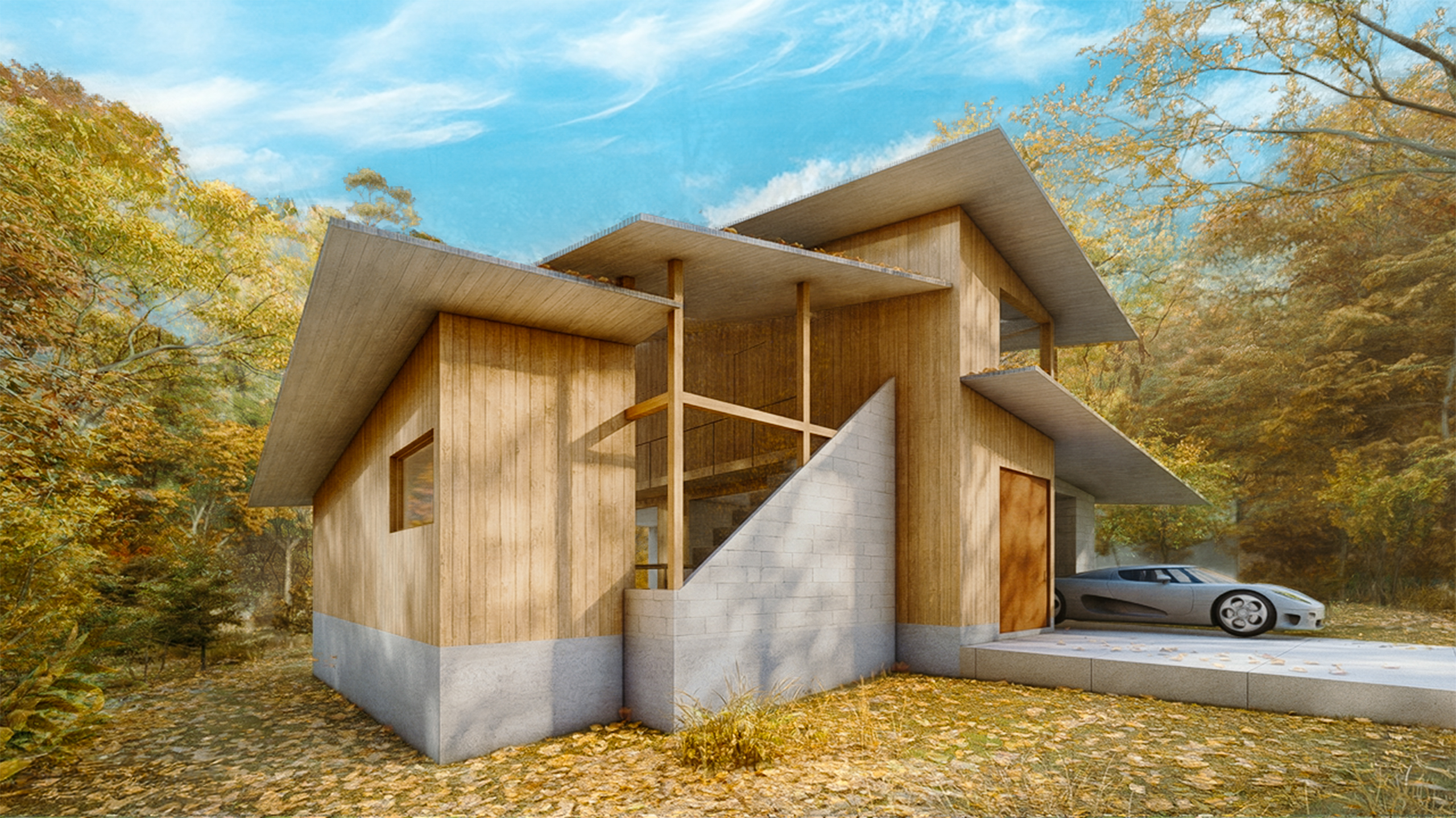 別荘の設計提案。町の景観条例に配慮しつつ、浅間山へ長手方向に視線が抜ける空間構成とした。プライバシーを確保しながらも、透明感のある空間を目指している。屋根ボリュームの分割や、2層分の階高を活かした窓際空間などにより、地域の環境にふさわしい快適性と開放性を両立させるデザイン。