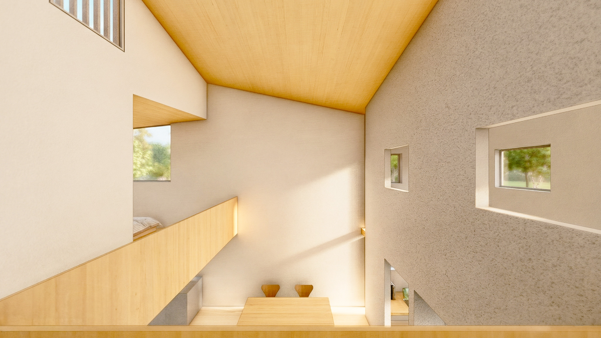 民間企業が主催する建売住宅の設計コンペへの提案。住まいの中心に「光のヴォイド」を設けた、家族の気配と視線、光が交錯する暮らしのデザイン。開口部は南北で機能を分担し、南側は絞った窓から印象的な光を導き、北側は虫籠窓をモチーフにしたハイサイドライトで、安定した光環境を確保する。