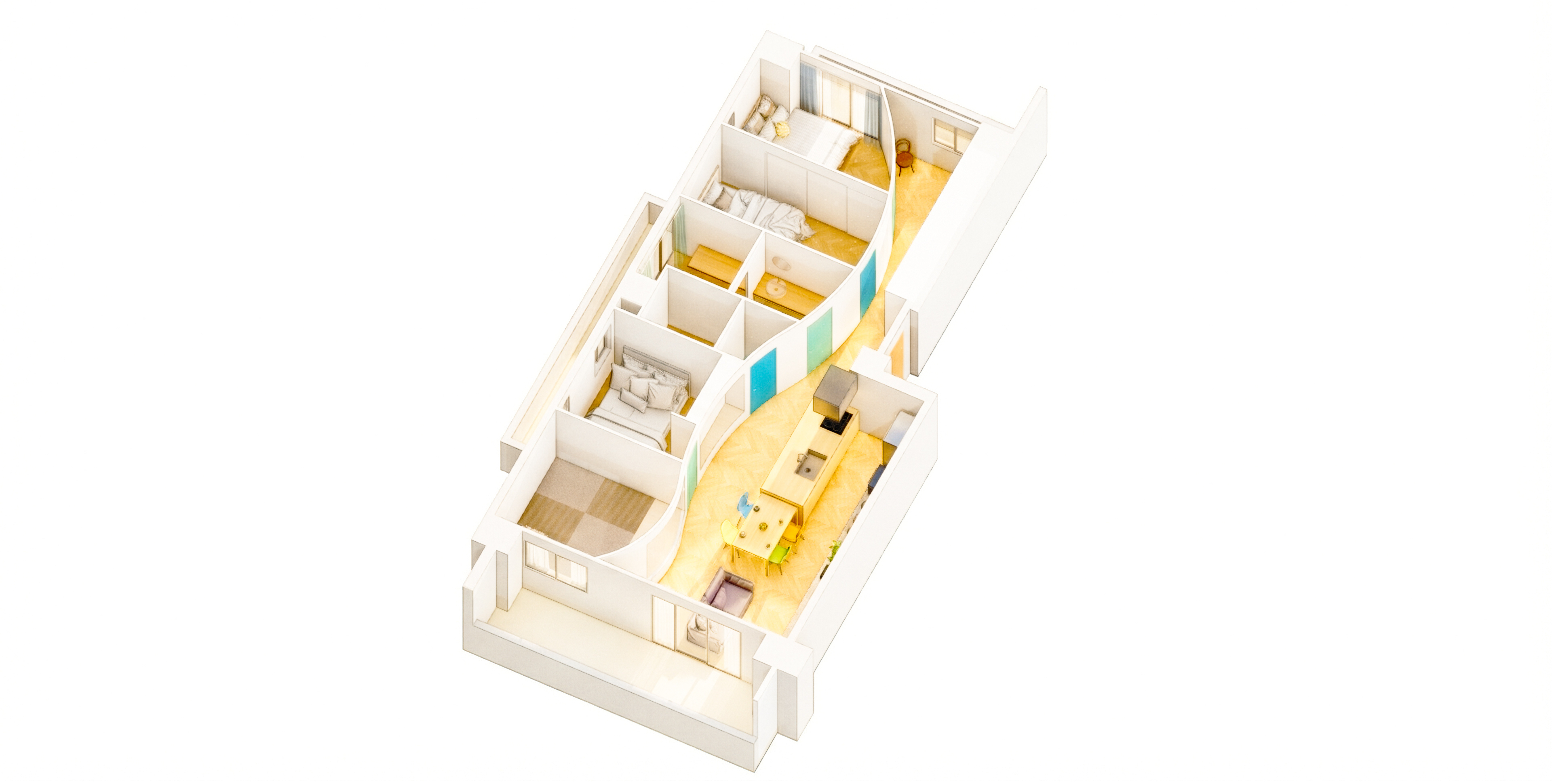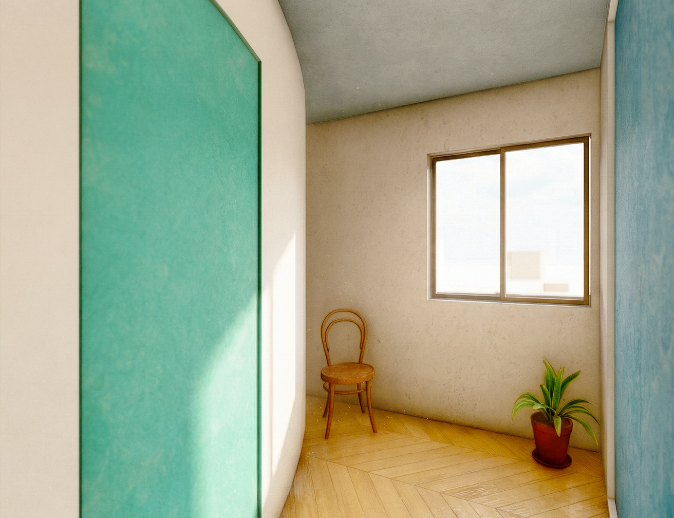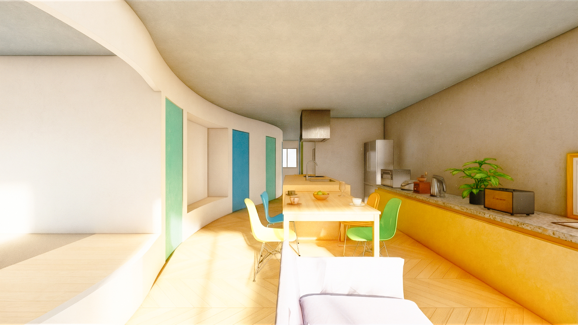 マンション改修の設計提案。ゆらぎのある曲面壁を配置し、そのゆらぎが生む“たまり”を、家の中に点在する小さな居場所するデザイン。視線をゆるやかに遮りながらもつなげる「見え隠れ」する奥行きによって、住まいの居場所を個室かリビングかの二択にせず、“こもれる”大小の居場所を点在させた。