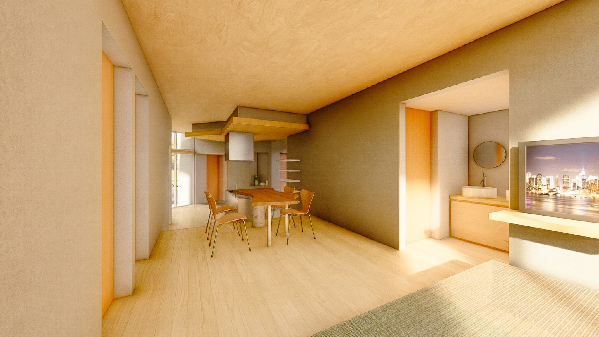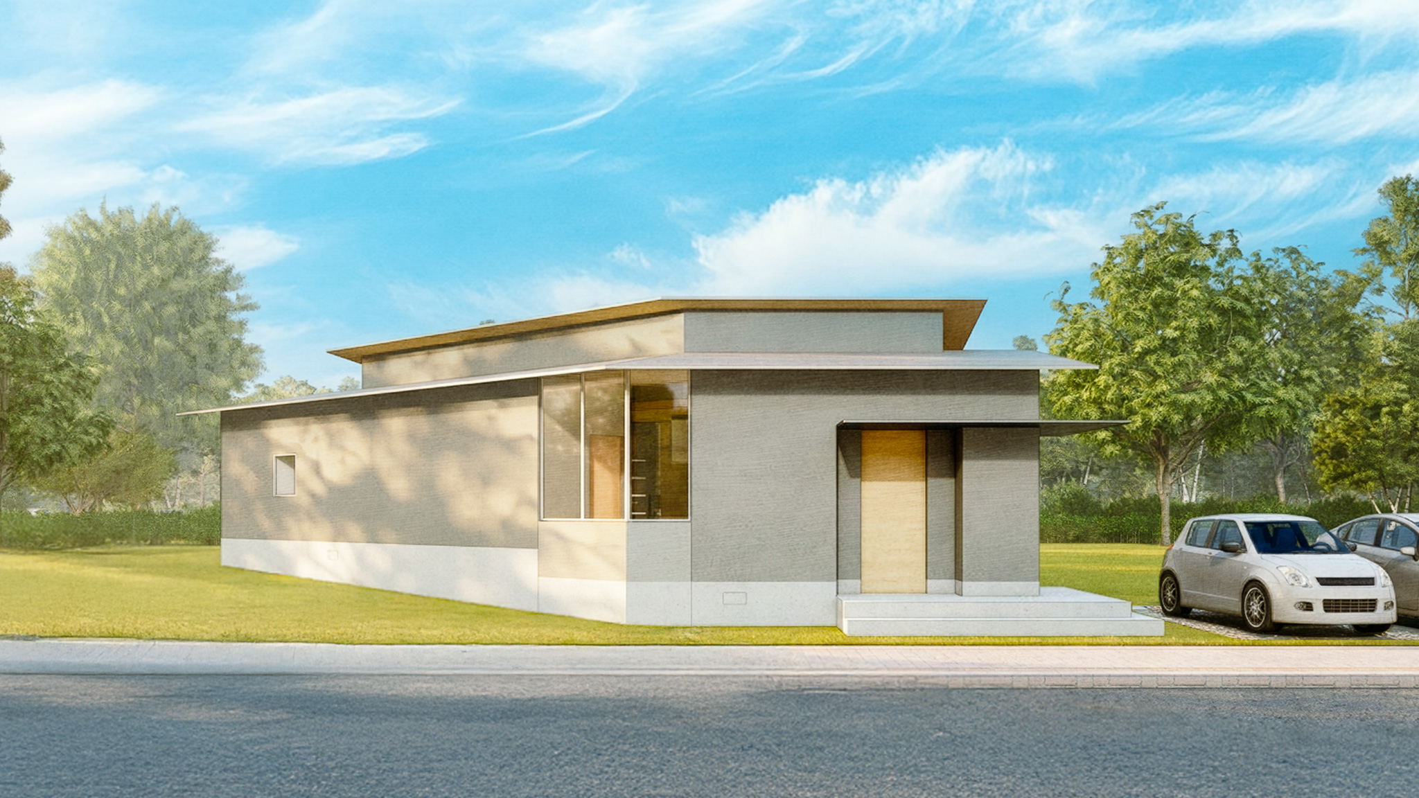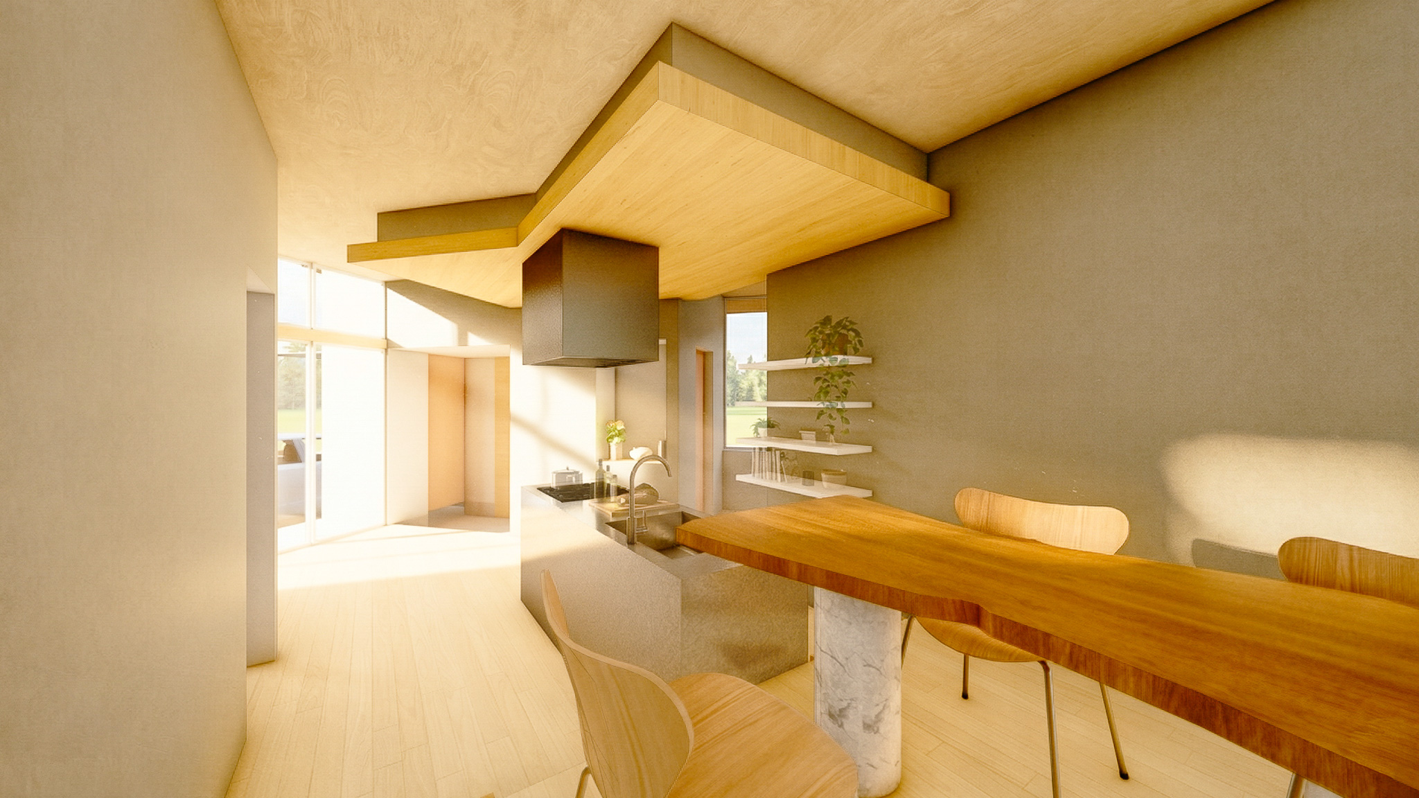 郊外住宅の設計提案。敷地形状に合わせた「くの字」の平面と、床レベルによって地盤高さを調整した断面による、地形に寄り添うデザイン。外周には玄関・水回り・居室を壁コアとしてまとめ、中心には廊下のない一体的なLDKを配置。3方向から光と風を取り込み、心地よい住まいを形成する。