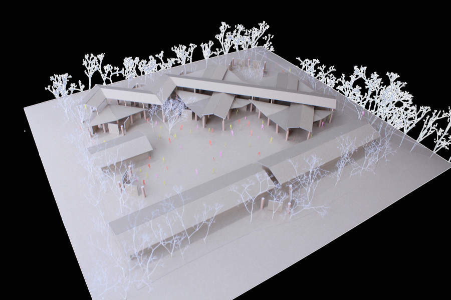 国際援助団体による集落のためのプリスクール(保育学校)の設計コンペへの提案。グリッドを斜めに用いスリットを設け、大きさと高さの異なる屋根を重ねることで、ポーラスな環境を創り出す。地域で手に入りやすく、加工しやすい素材を使用する建築の提案。