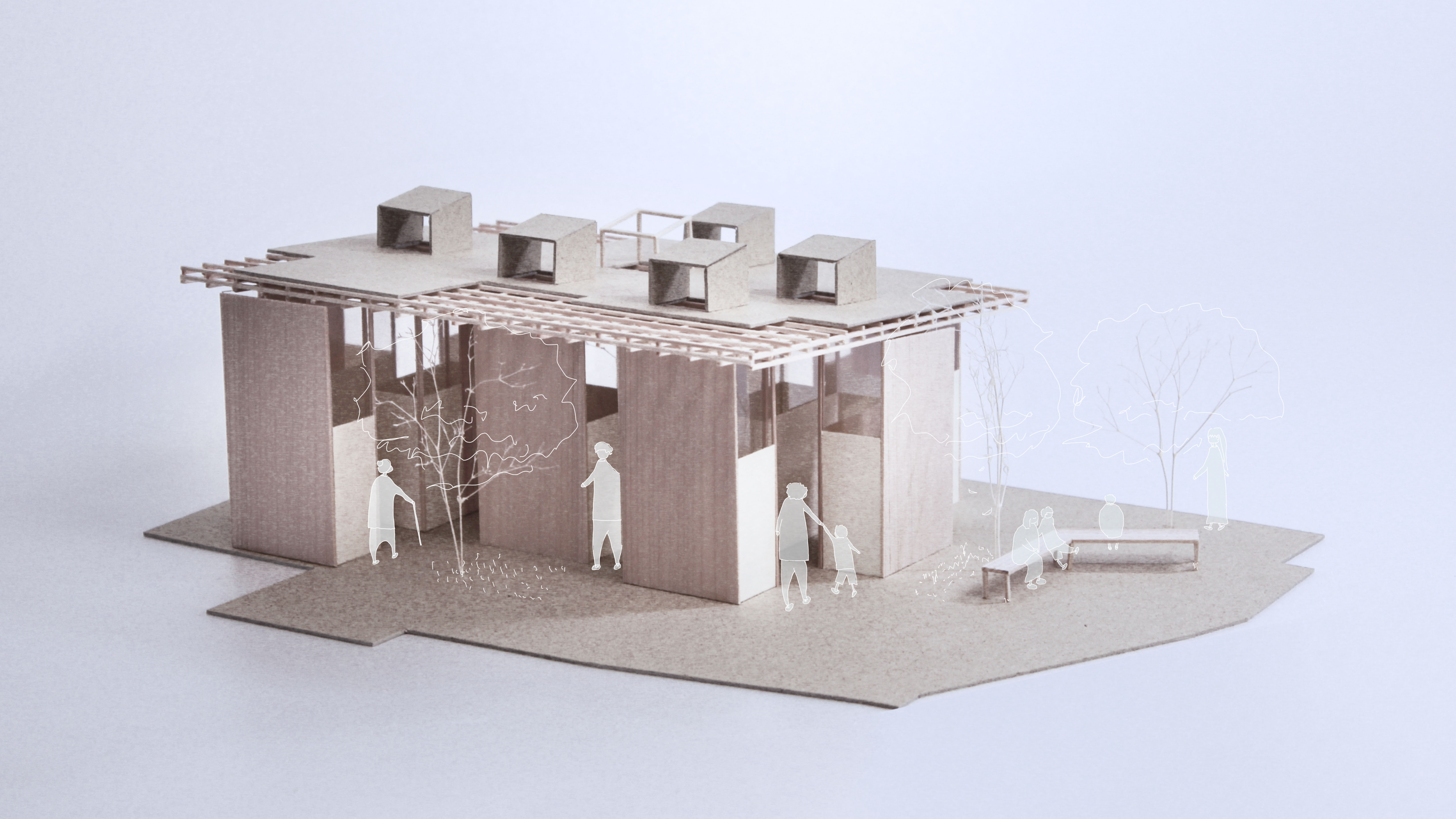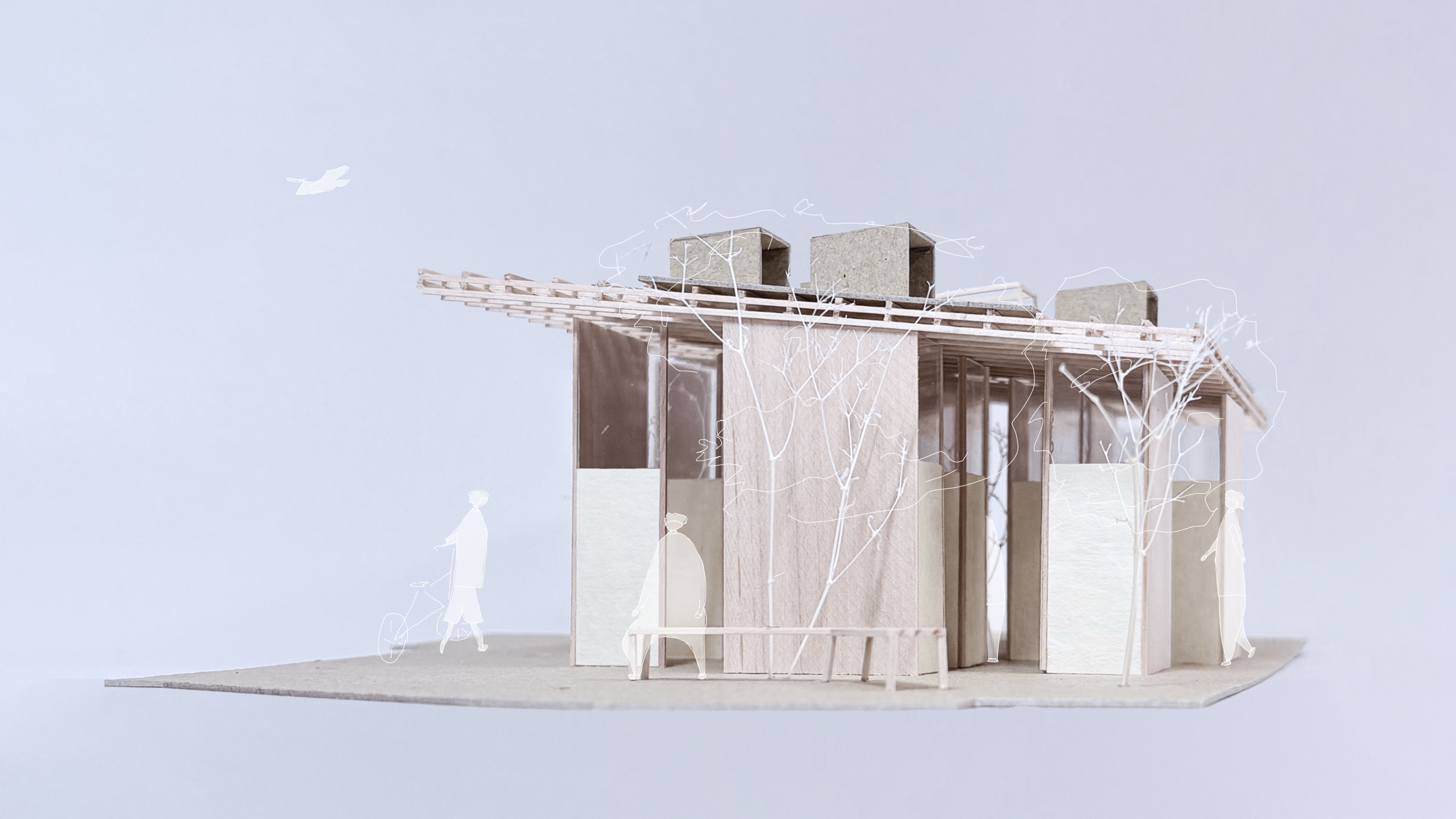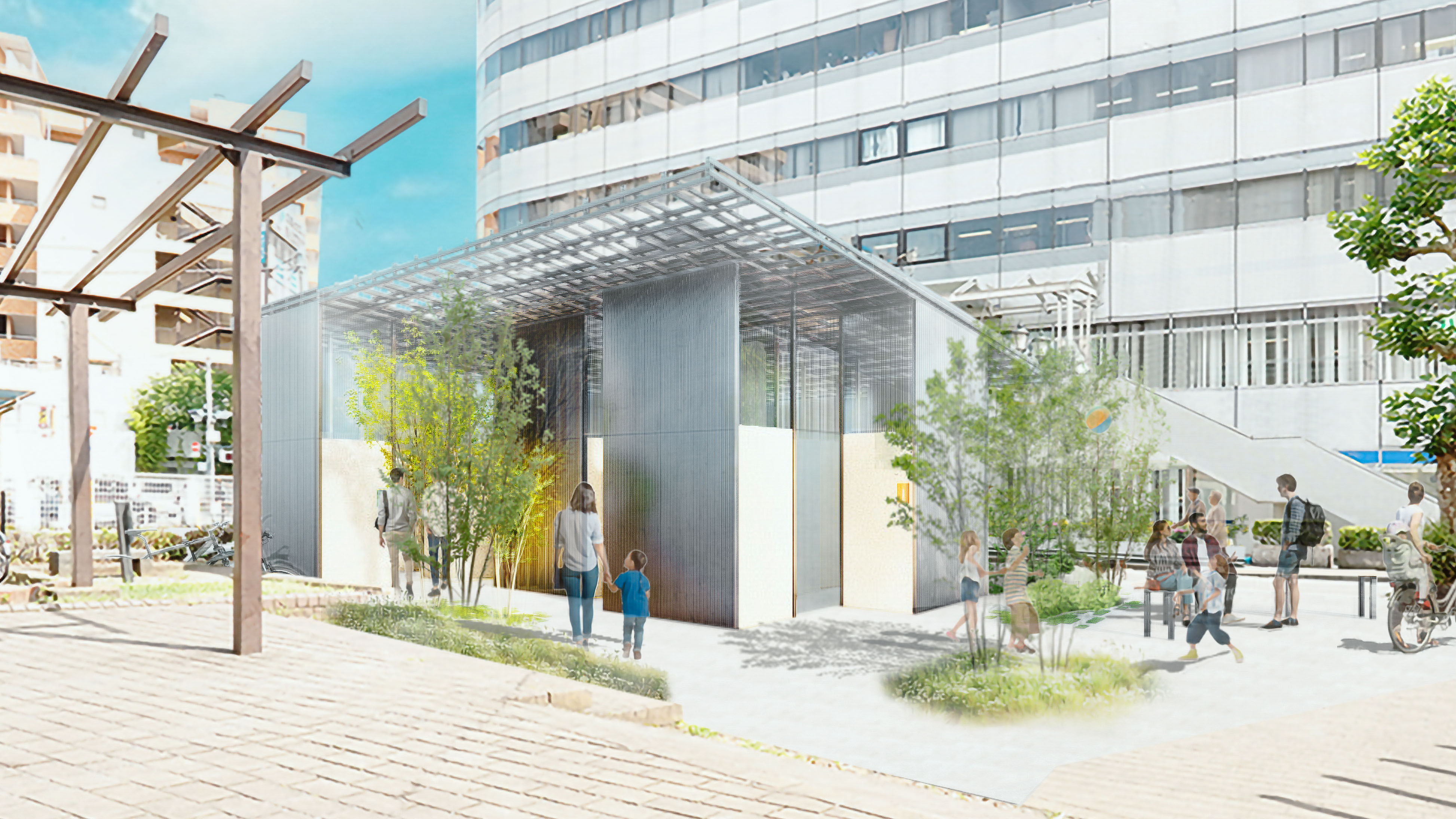 市が駅前公園に設置する公衆トイレの設計プロポーザルへの提案。角鋼管という単一素材を軸として、軽快で経済的なユニバーサルスペースを提案。蚕室建築をモチーフにした「気抜窓(ハイサイドライト)」を採用し、常時通風と自然採光により、快適な室内環境を実現するデザイン。