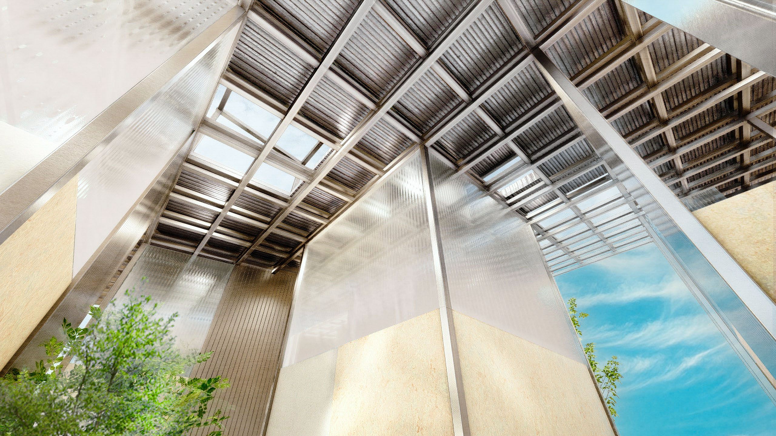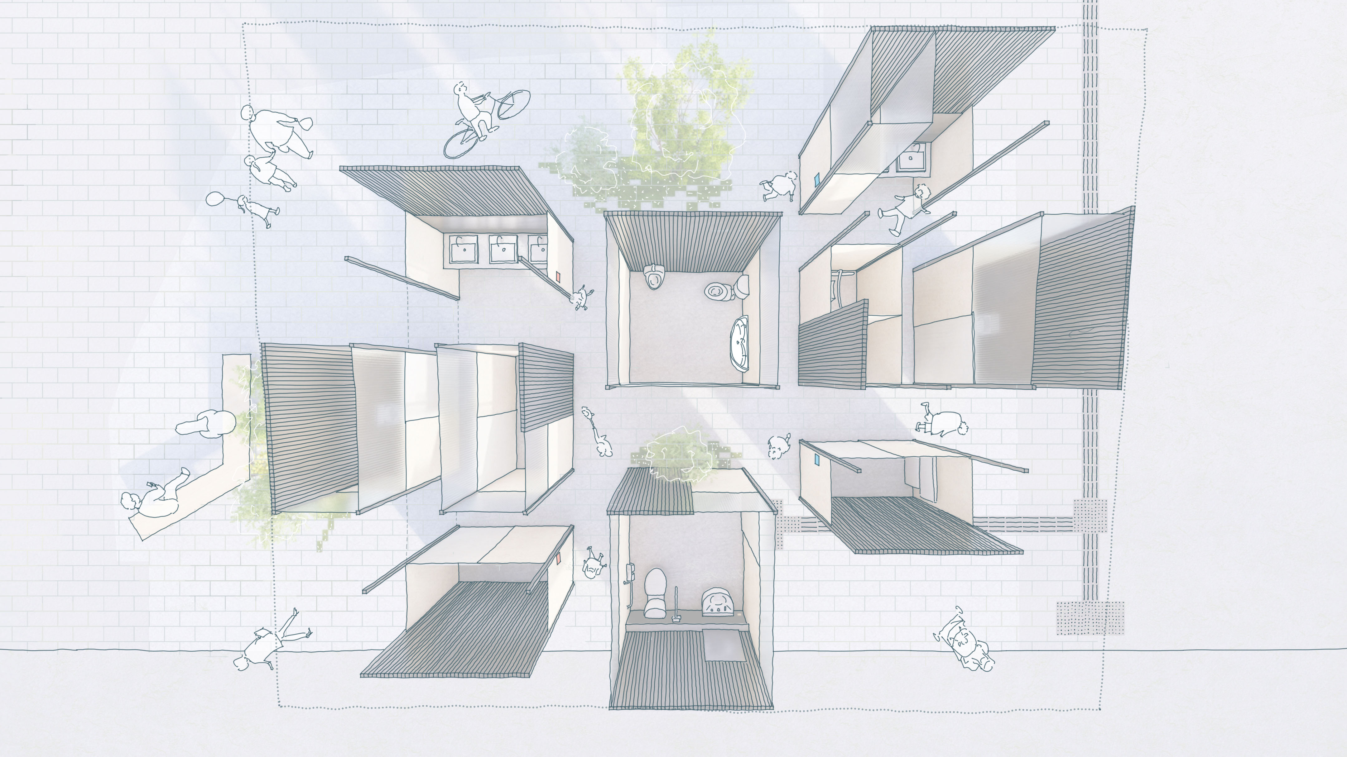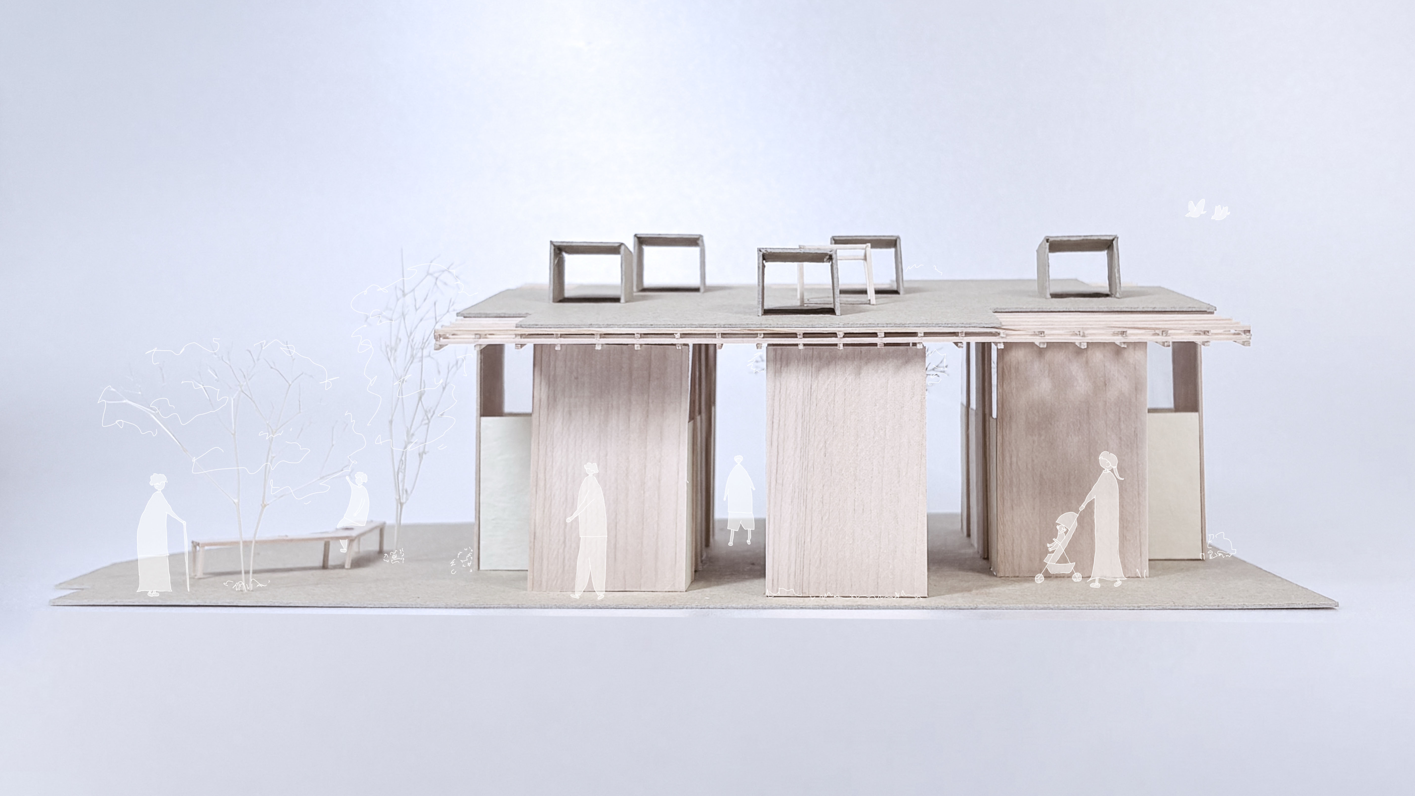 市が駅前公園に設置する公衆トイレの設計プロポーザルへの提案。角鋼管という単一素材を軸として、軽快で経済的なユニバーサルスペースを提案。蚕室建築をモチーフにした「気抜窓(ハイサイドライト)」を採用し、常時通風と自然採光により、快適な室内環境を実現するデザイン。