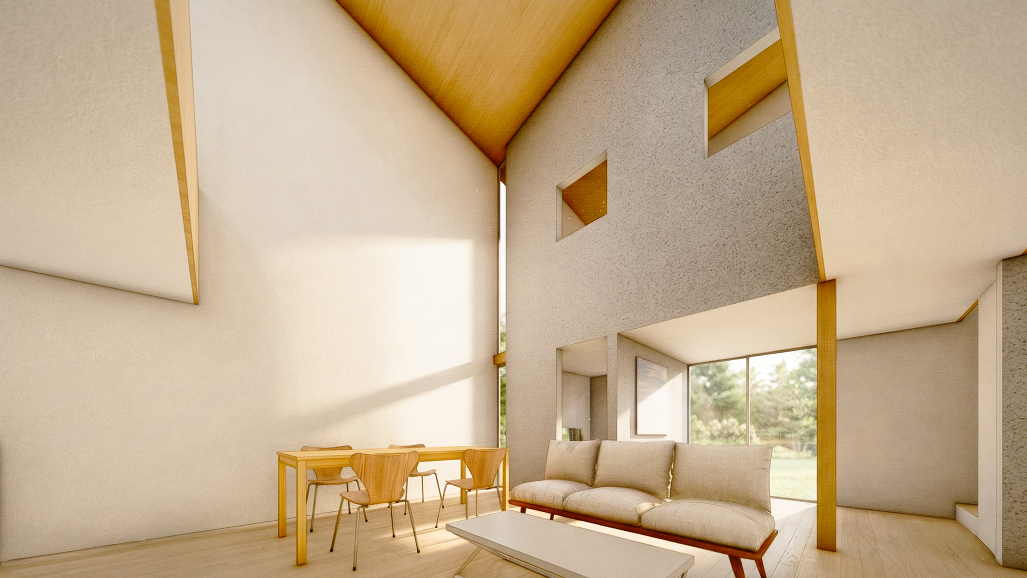 民間企業が主催する建売住宅の設計コンペへの提案。住まいの中心に「光のヴォイド」を設けた、家族の気配と視線、光が交錯する暮らしのデザイン。開口部は南北で機能を分担し、南側は絞った窓から印象的な光を導き、北側は虫籠窓をモチーフにしたハイサイドライトで、安定した光環境を確保する。