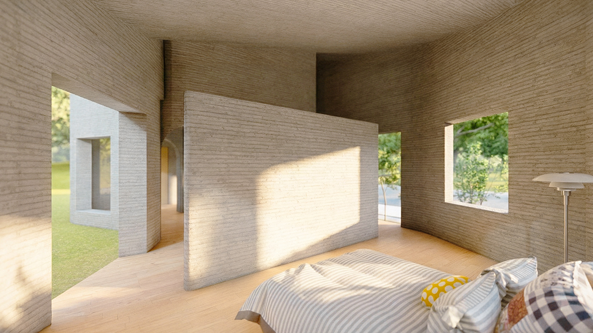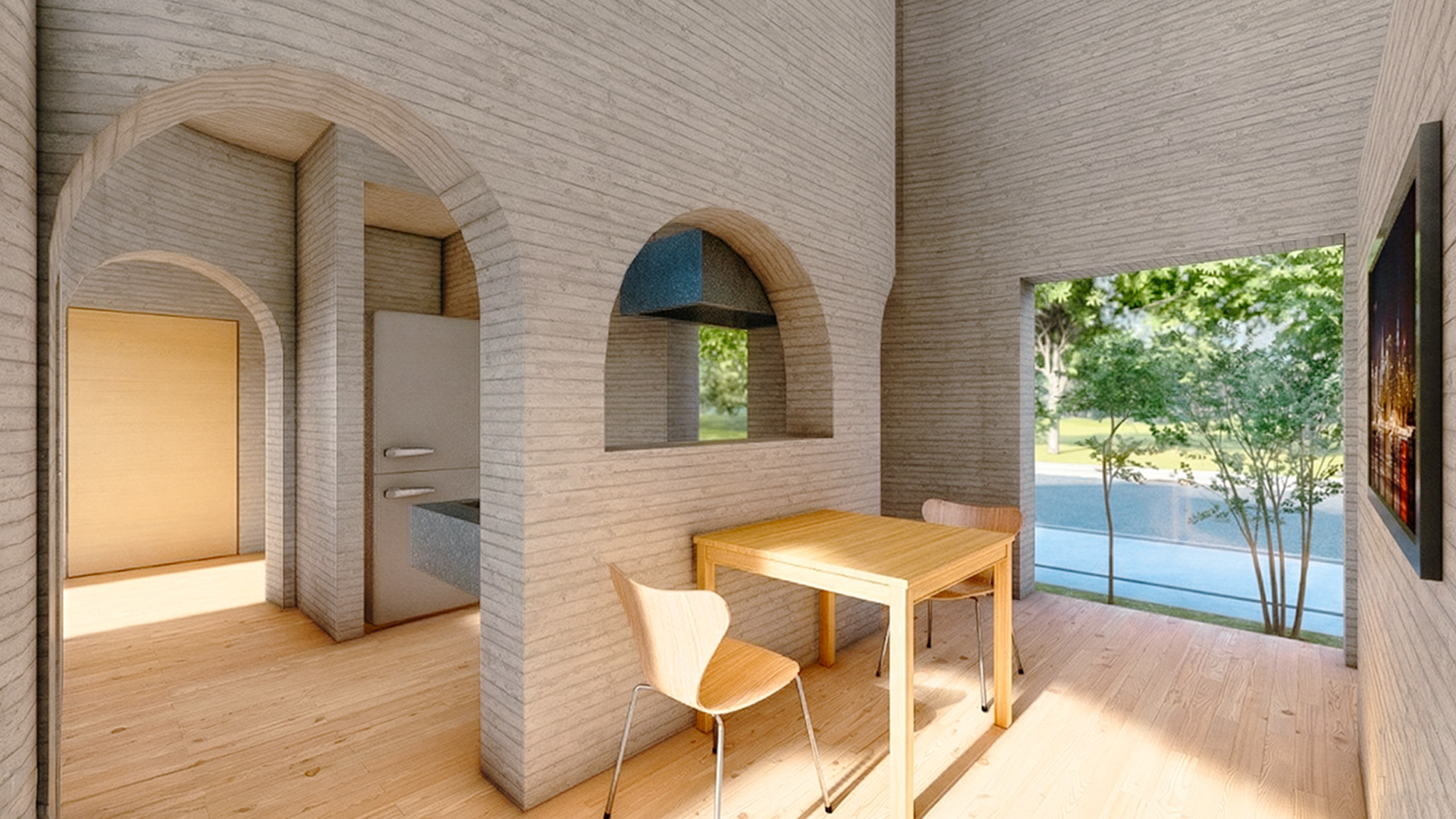 民間企業が主催する3Dプリンター住宅の設計コンペへの提案。3D プリンターの積層という原初的な造形操作を用いた塊のデザイン。地層が隆起し“生え出す” ように、3 つの房状ボリュームがゆるやかに連なり、内部では連続曲面が住まい手を包み込む、洞窟的な一室空間を構成する。